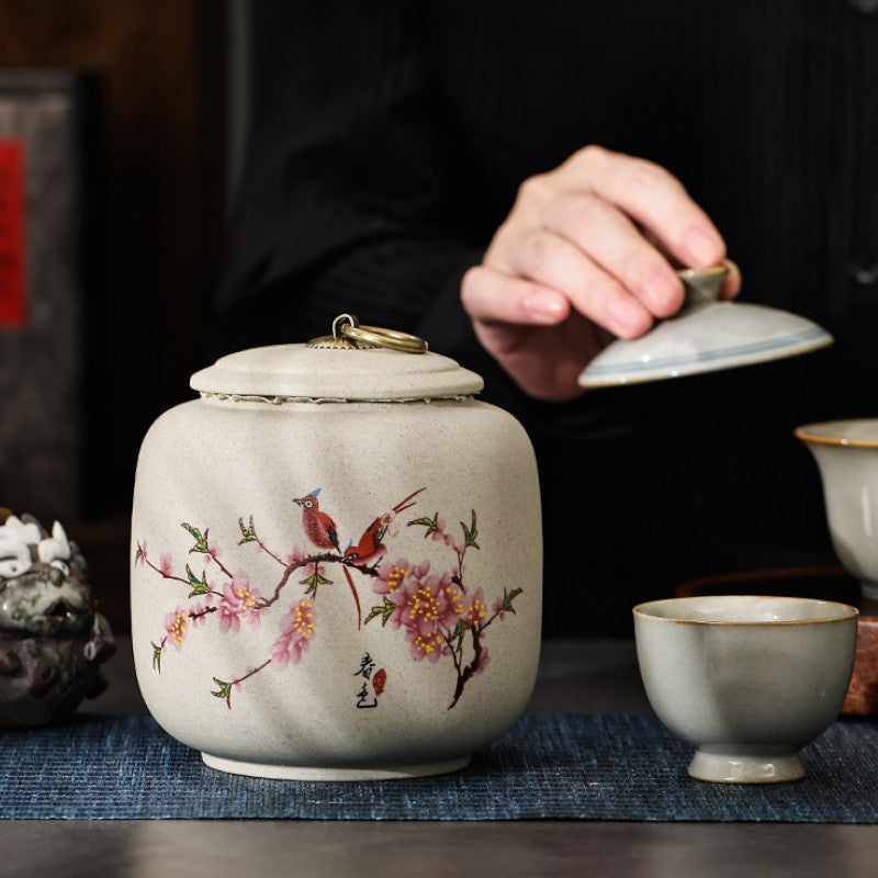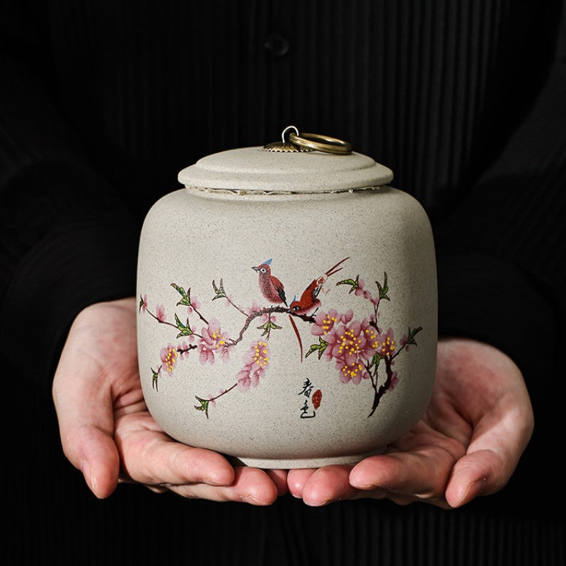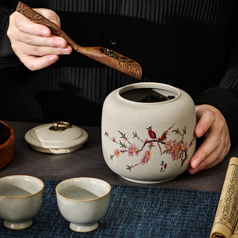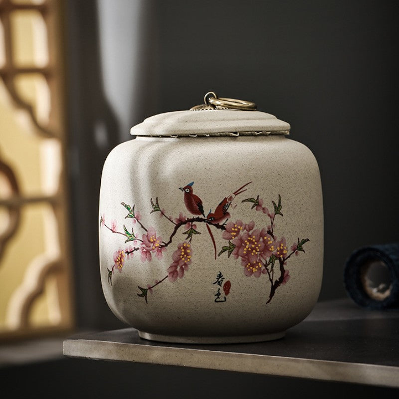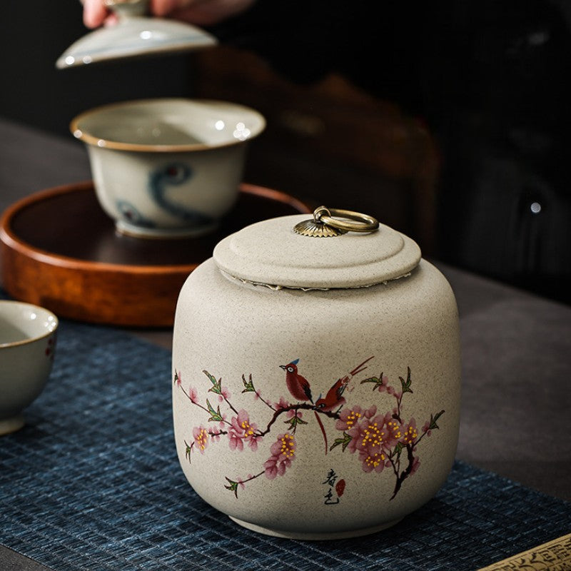• Poésie printanière figée: Oiseaux perchés sur branches de cerisier, objet d'art japonais qui embellit votre étagère à thé