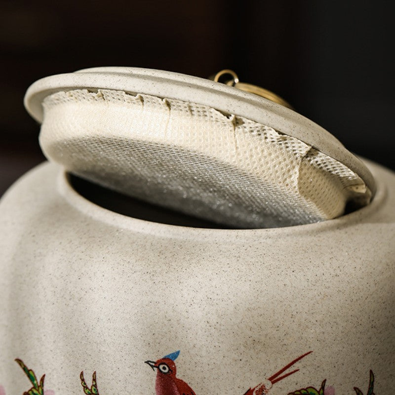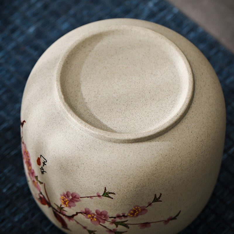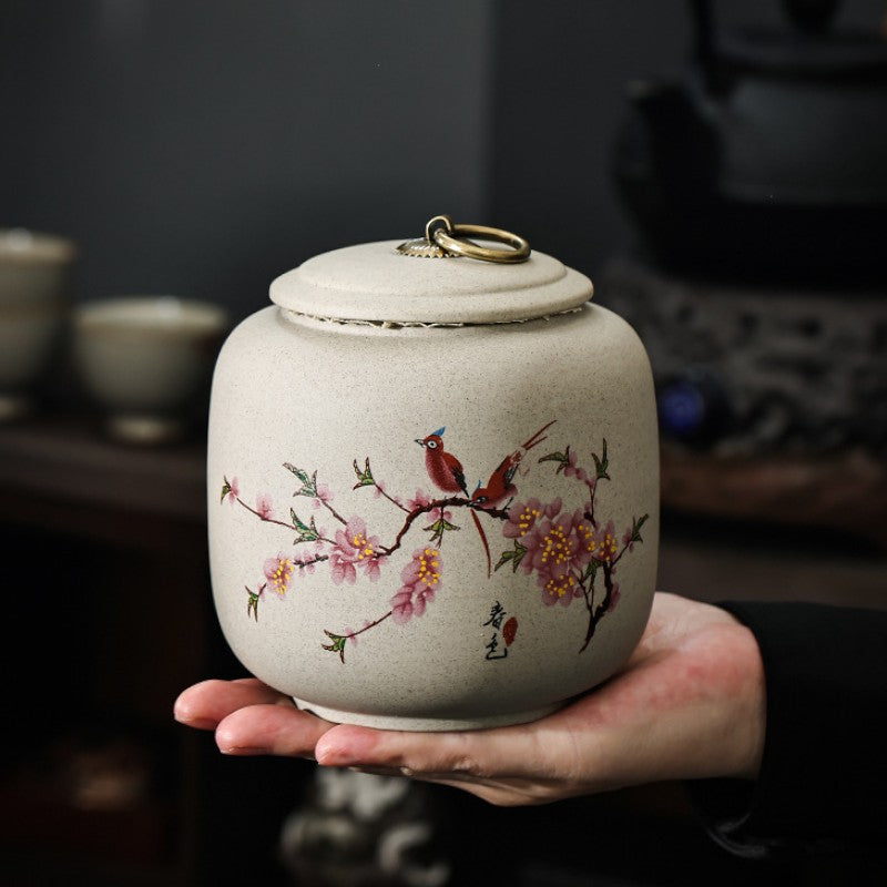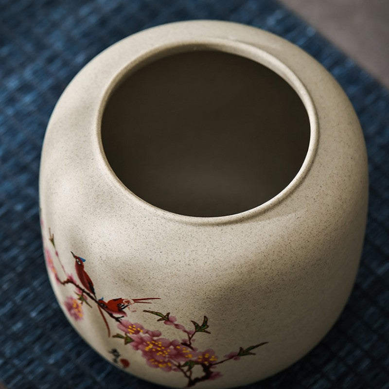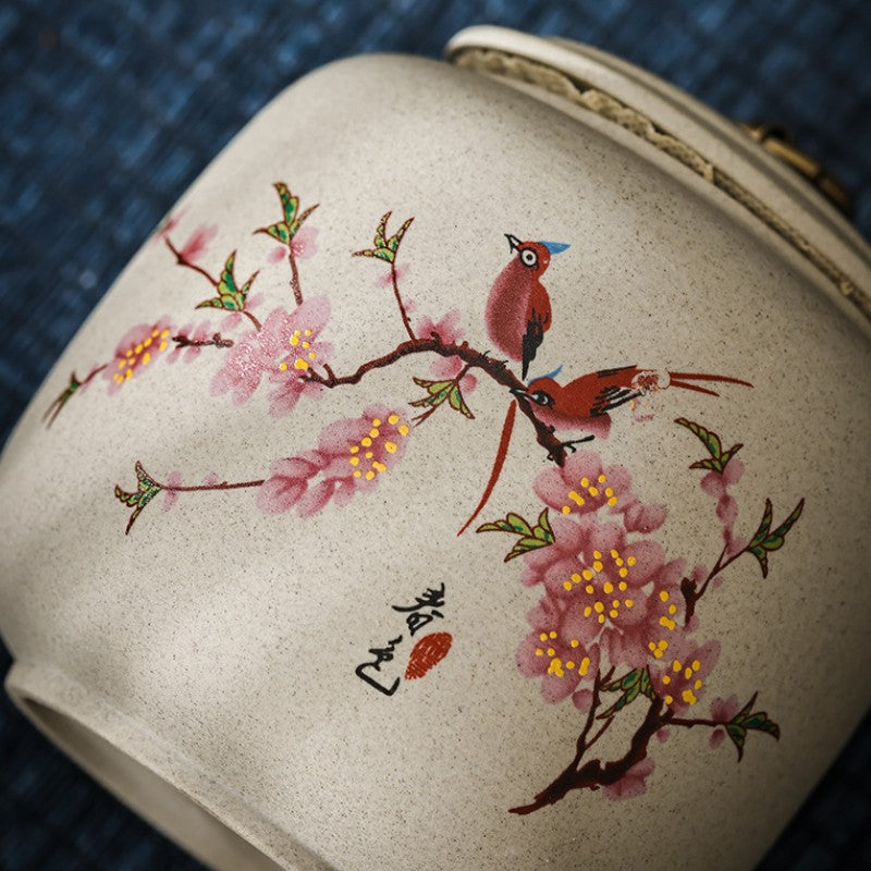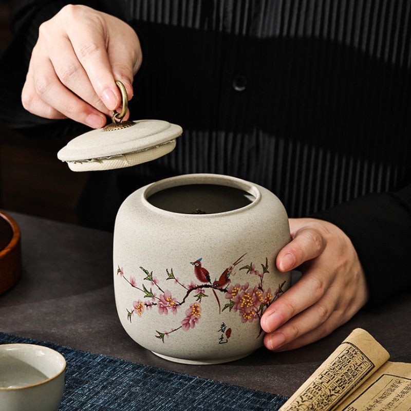 • Poésie printanière figée: Oiseaux perchés sur branches de cerisier, objet d'art japonais qui embellit votre étagère à thé