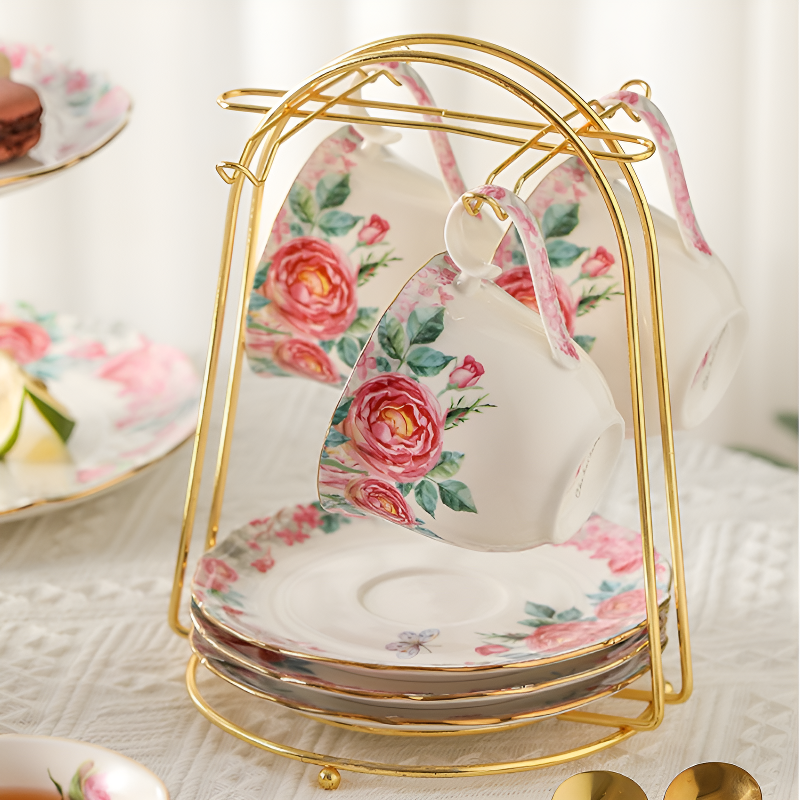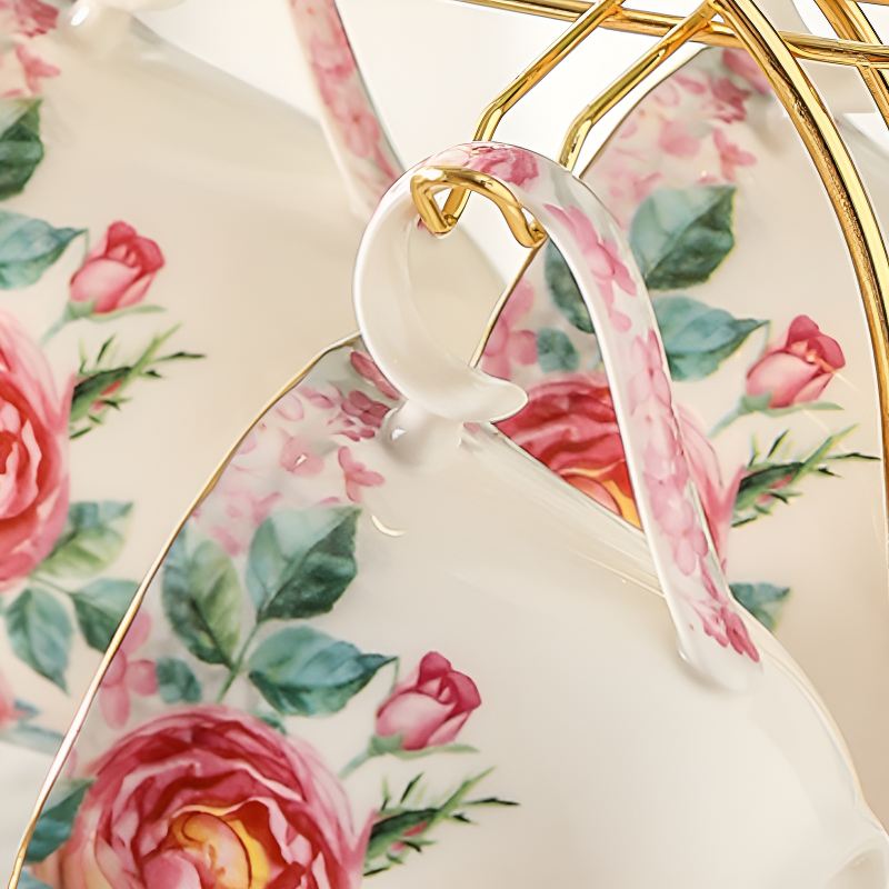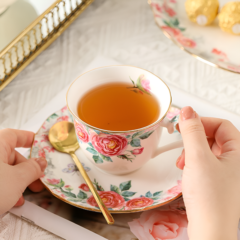 • Roses anglaises comme à Londres: Décor floral généreux et dorures précieuses sur porcelaine, 4 soucoupes incluses pour afternoon tea authentique