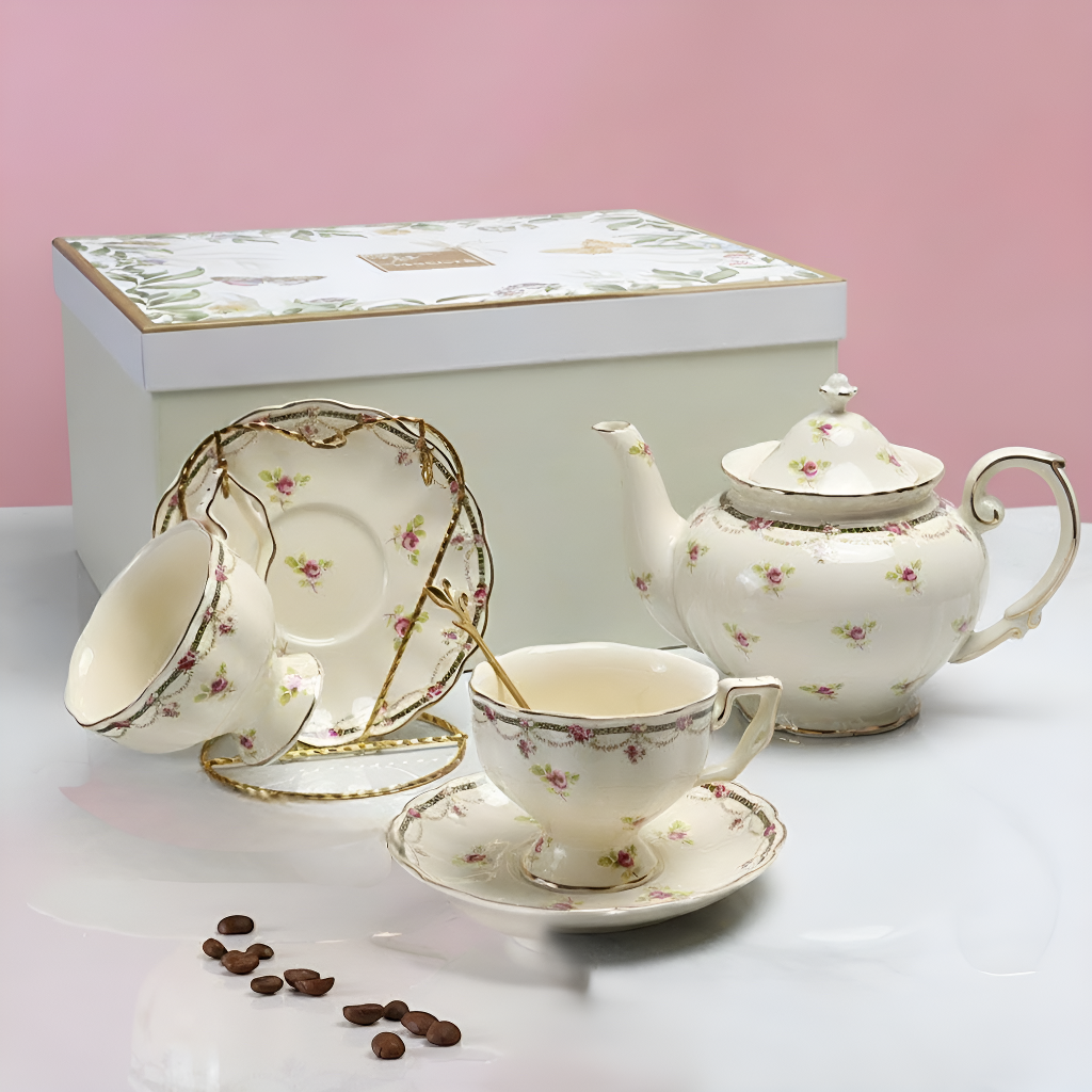 • Victorien complet tout inclus: Théière, 4 tasses, soucoupes, cuillères assorties ET support métallique dans coffret cadeau, rien à ajouter