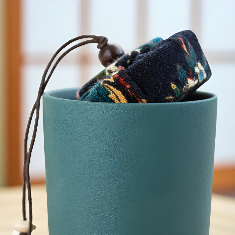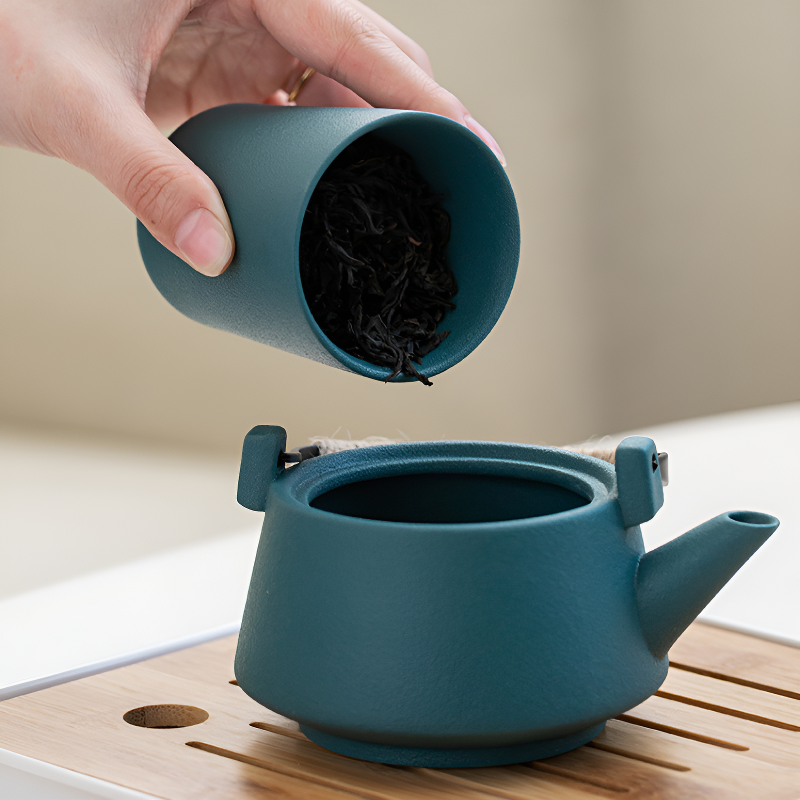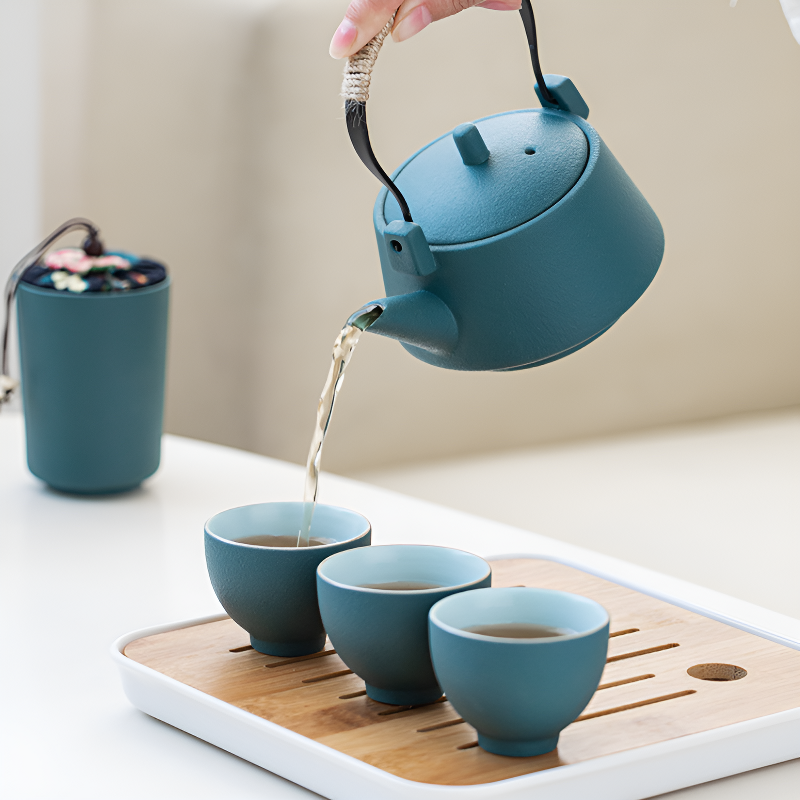 • Vert canard nature apaisant: Théière et tasses céramique vert pétrole mat sur plateau bois naturel, fusion zen-nordique qui transforme votre pause en rituel slow-living