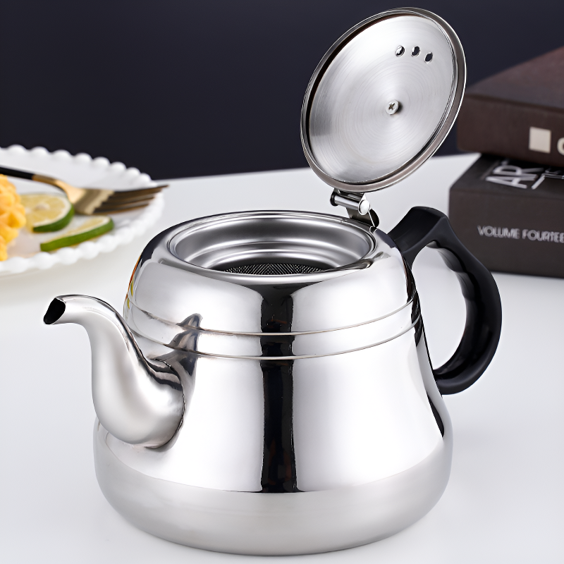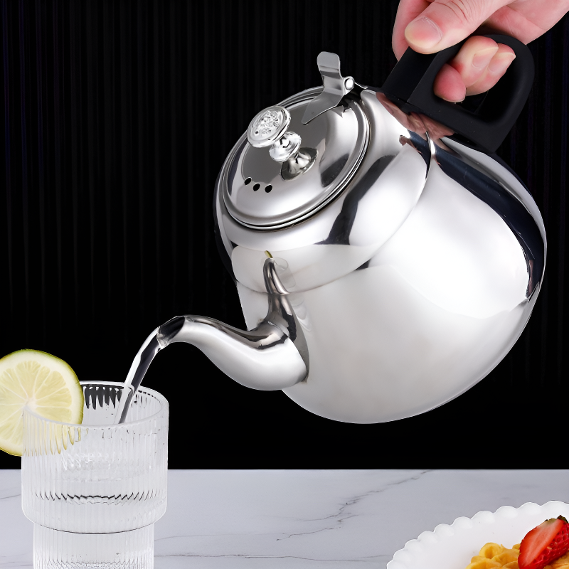 • Sculpture contemporaine brillante: Inox poli miroir et poignée noire contrastée transforment votre théière en objet design statement